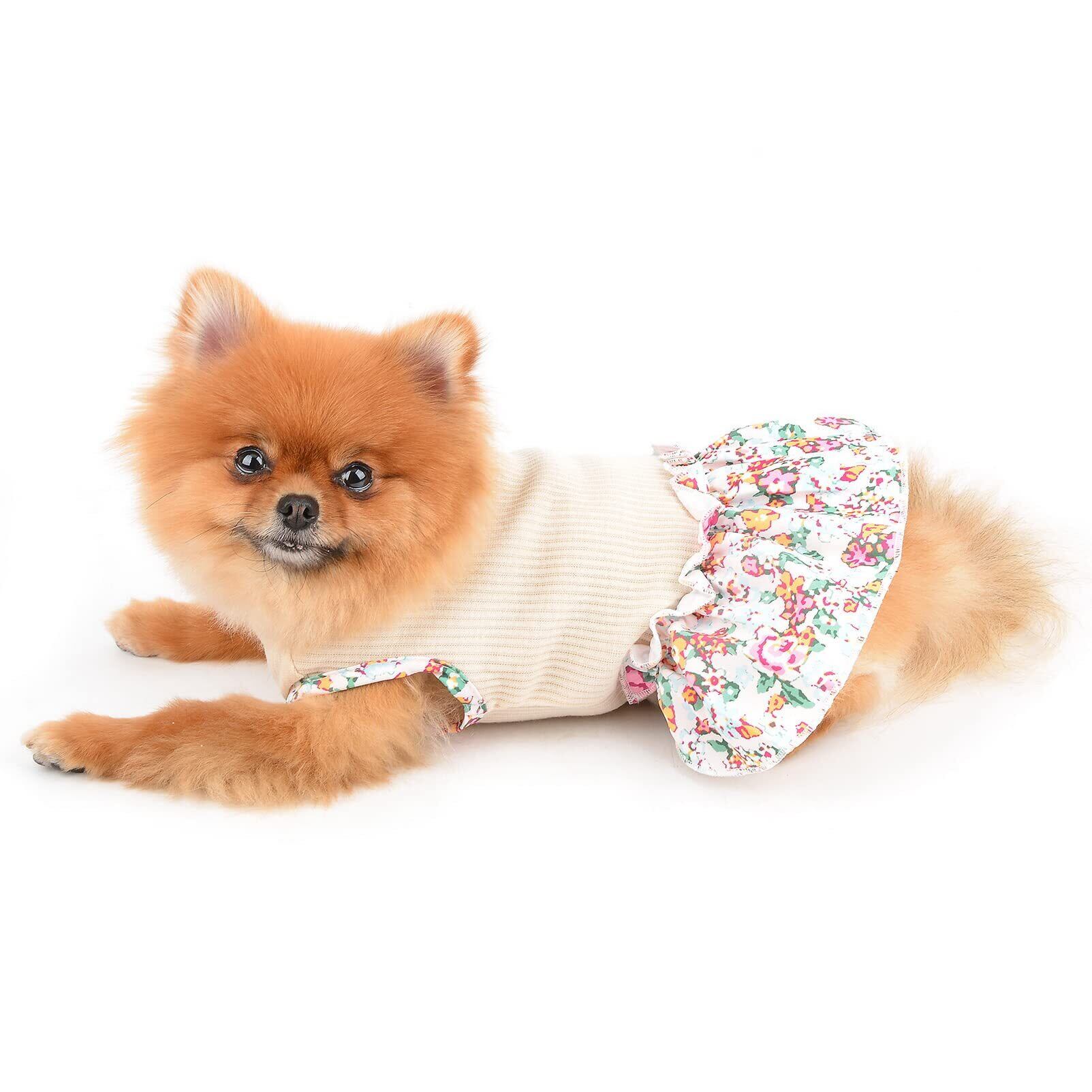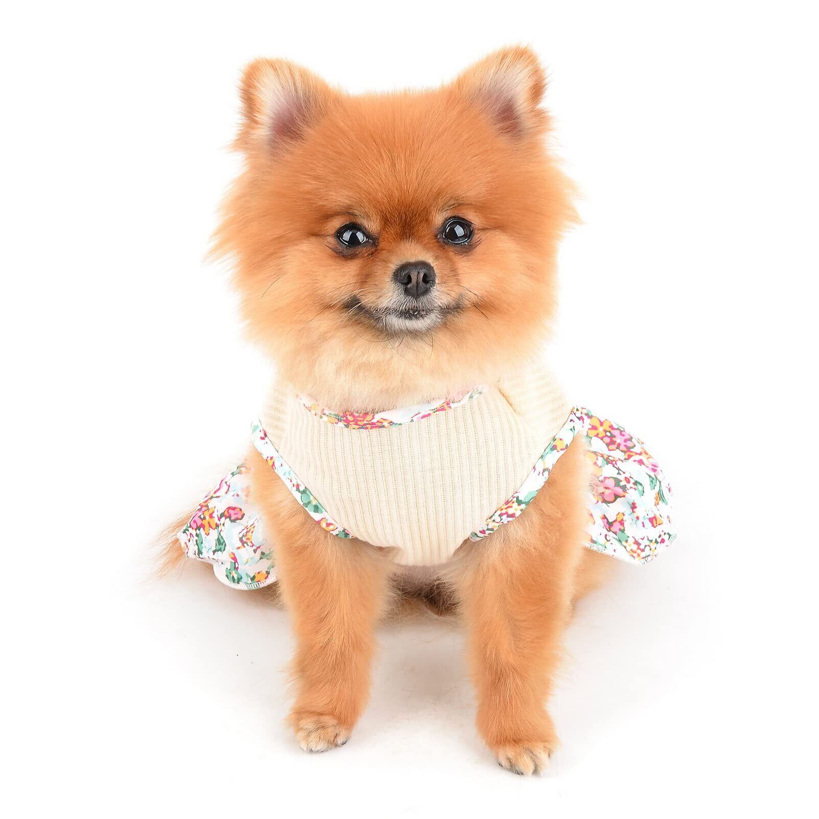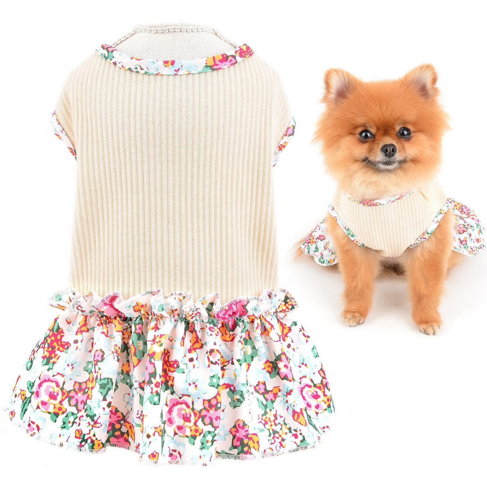 SMALLLEE_LUCKY_STORE 犬服 小型犬 春夏 ニット花柄 ワンピース お姫様 簡単着脱 女の子猫服 洋服,ベージュ,XS