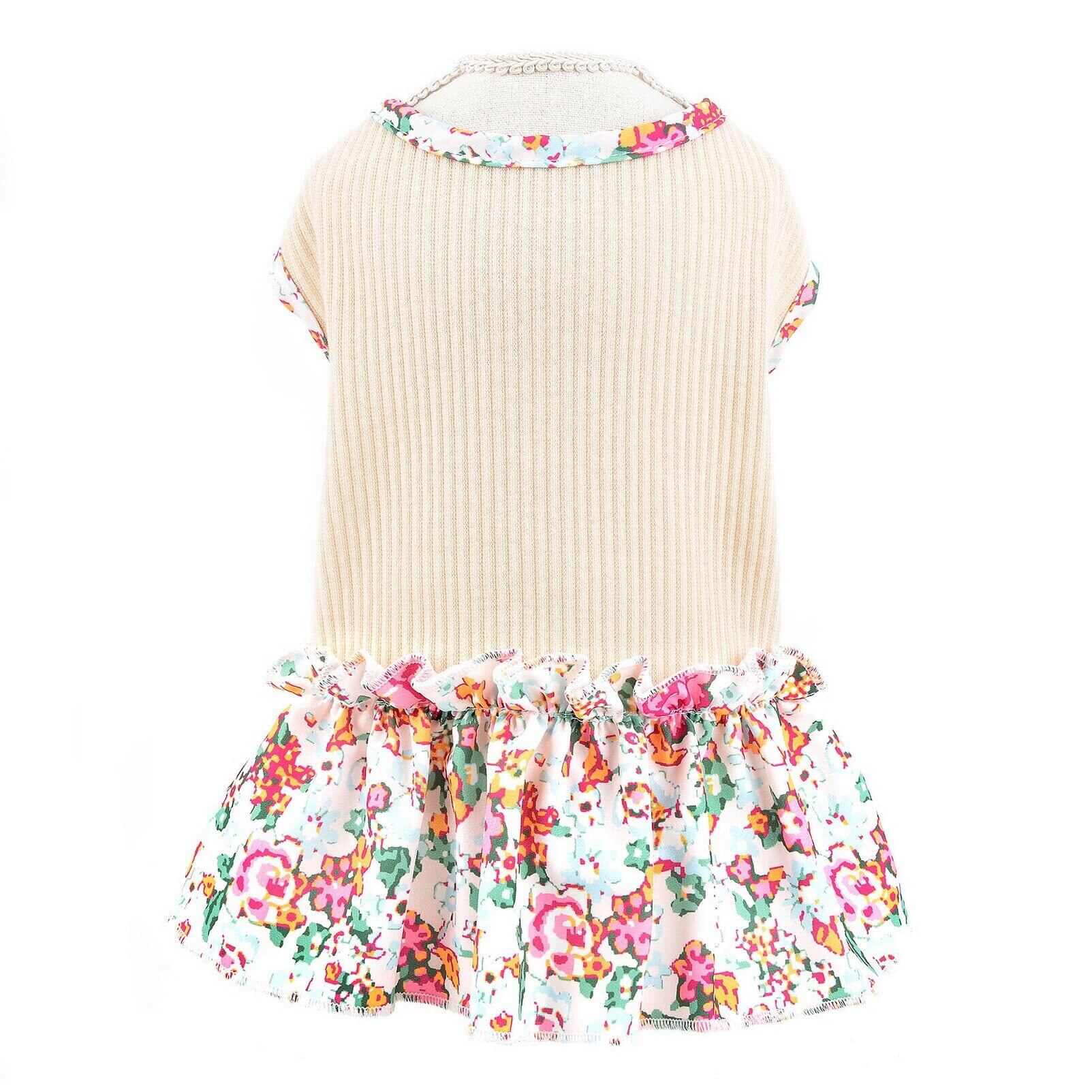 SMALLLEE_LUCKY_STORE 犬服 小型犬 春夏 ニット花柄 ワンピース お姫様 簡単着脱 女の子猫服 洋服,ベージュ,L