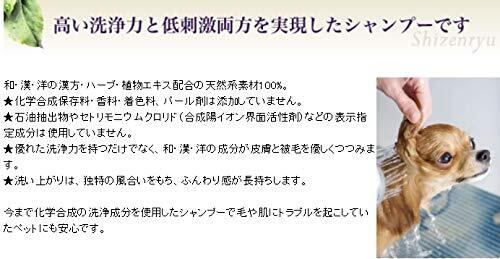 <トリートメントシャンプー商品説明>●和・漢・洋35種類の漢方・ハーブ・植物エキス配合、100%天然系素材●天然ハーブの洗浄力で、毛の汚れやほこりなどの頑固な汚れをすっきり落とす、洗浄効果の高いシャンプーです。●さっぱりと洗い上げたい短毛種や体臭の強い犬種、汚れのひどい犬・猫にお薦めです。●全犬種、全猫種対応<コンディショナー商品説明>和・漢・洋36種類の漢方・ハーブ・植物エキス配合の天然系素材100%。毛の乾燥や傷みが気になる、また、高い保湿効果を得たいという方へ。天然成分の保湿効果でブラッシング時に起きる静電気を抑え、毛をよりなめらかにします。毛の乾燥や傷みが気になる場合や高い保湿効果を得たい場合にご使用下さい。