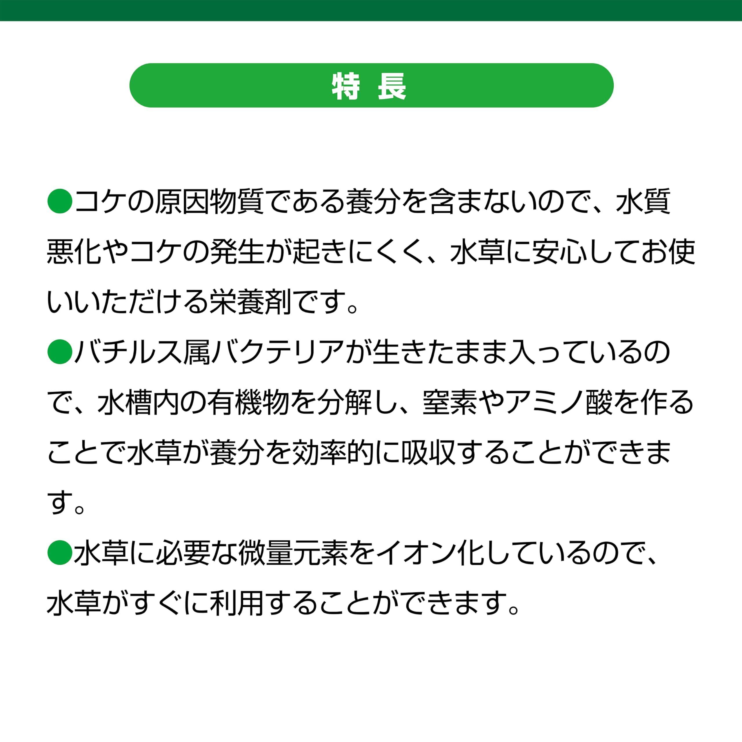 <特長>●コケの原因物質である養分を含まないので、水質悪化やコケの発生が起きにくく、水草に安心してお使いいただける栄養剤です。 ●バチルス属バクテリアが生きたまま入っているので、水槽内の有機物を分解し、窒素やアミノ酸を作ることで水草が養分を効率的に吸収することができます。 ●水草に必要な微量元素をイオン化しているので、水草がすぐに利用することができます。