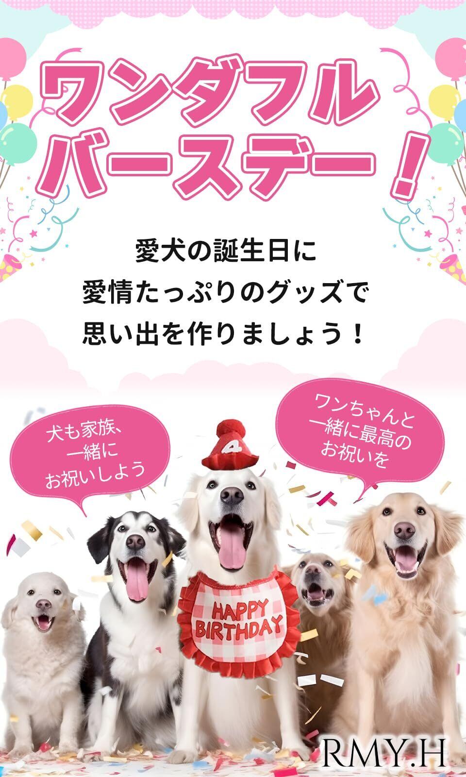 【商品の強み】可愛いデザインの帽子で簡単に装着できます。よだれかけはお祝いのメッセージがプリントされており優しい素材の為安心してペットの首に巻けます。数字は0~9の数字がついており年齢を問わず再利用も可能です✨