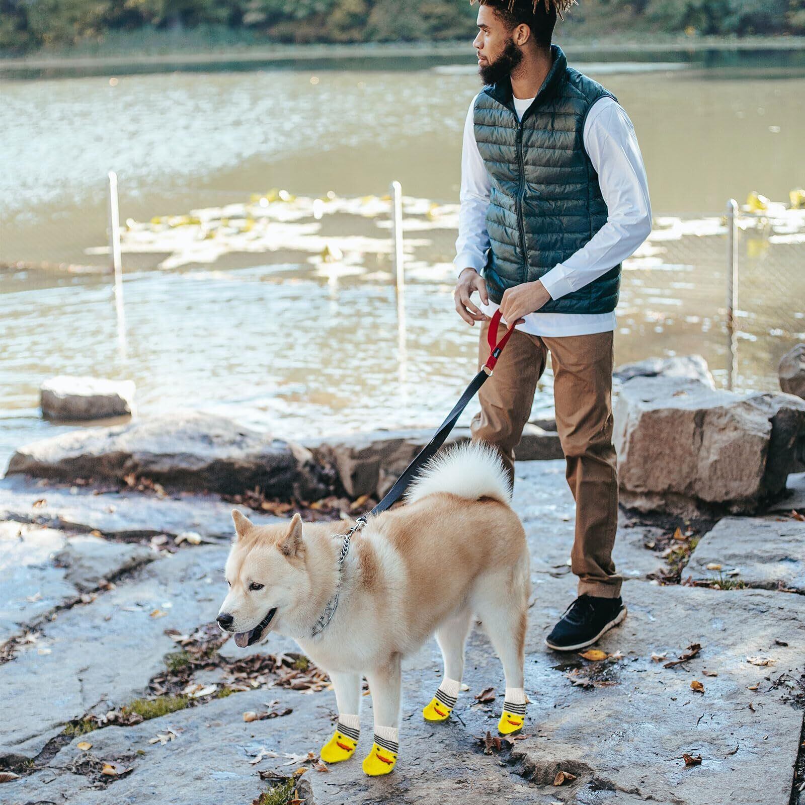 犬 靴下 4個セット 犬用靴下 滑り止め 脱げない 犬 ソックス 肉球保護 防寒 可愛い ペット 靴下 舐め防止 汚れ防止 室内 室外 お出かけ 小型犬 中型犬 (イエロー, L)