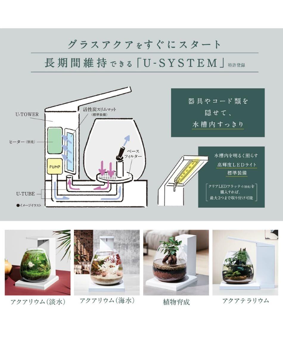 お部屋に素敵なインテリア空間を! グラスアクアをすぐにスタートできるオールインワン水槽セット。 U-SYSTEM採用で器具やコード類をすっきり隠せて、水槽内すっきり。 【アダプターは別売です】 水槽内を明るく照らす高輝度LEDライト標準装備!クリアLEDフラッティ(別売)を購入すれば最大3つまで取り付け可能!CO2添加などして本格的に水草を育てたい、お部屋のなかで圧倒的な明るさのインテリアとして設置したい、などいろいろな楽しみ方に合わせることが可能です。 メンテナンスも簡単、便利! 汚れてきたら、レイアウトを崩さず、U-TOWERから水換えができる!レイアウト水槽内を触らずに水抜き、水換えができるのでお魚にもやさしい。 テラリウムを楽しむ! 水位を落とした楽しみ方もOK。底面ろ過を優先することで、U-TOWER内の低水位によるろ過効率ダウンを補うことができます。 背が高いテラリウムや植物育成がしたい場合はLEDを外しても使えるろ過槽用フタも付属。 ●水槽サイズ:約幅20.0×奥行20.0×高さ20.0cm ●水容量:約6L(ろ過槽含む) ●製品重量:約1.5kg(水槽・用品含む) ●セット時サイズ(LED含む):幅20.5×奥行33.0×高さ31.5cm ●【ポンプ】定格電圧/消費電力:DC5V 0.4W アダプター使用時の消費電力:AC100V 0.6W 流量:1.6L/分 使用アダプター(別売):USBアダプターG-1A 入力:AC100V 出力:DC5V 1A コード長:約1.6m ●【LED】定格電圧/消費電力:DC5V 1.5W アダプター使用時の消費電力:AC100V 2.4W 使用アダプター(別売):USBアダプターG-1A 入力:AC100V 出力:DC5V 1A コード長:約1.5m(中間接続部含む) ●材質:ABS、ガラス ※本製品にはUSBアダプターは付属していません!LED、ポンプに各DC5V 1A以上のUSBアダプターが必要です。当社純正品(USBアダプター G-1A×2個/G-2A・2ポート×1個)もしくは市販のUSBアダプター(DC5V 1A以上)をお買い求めください。