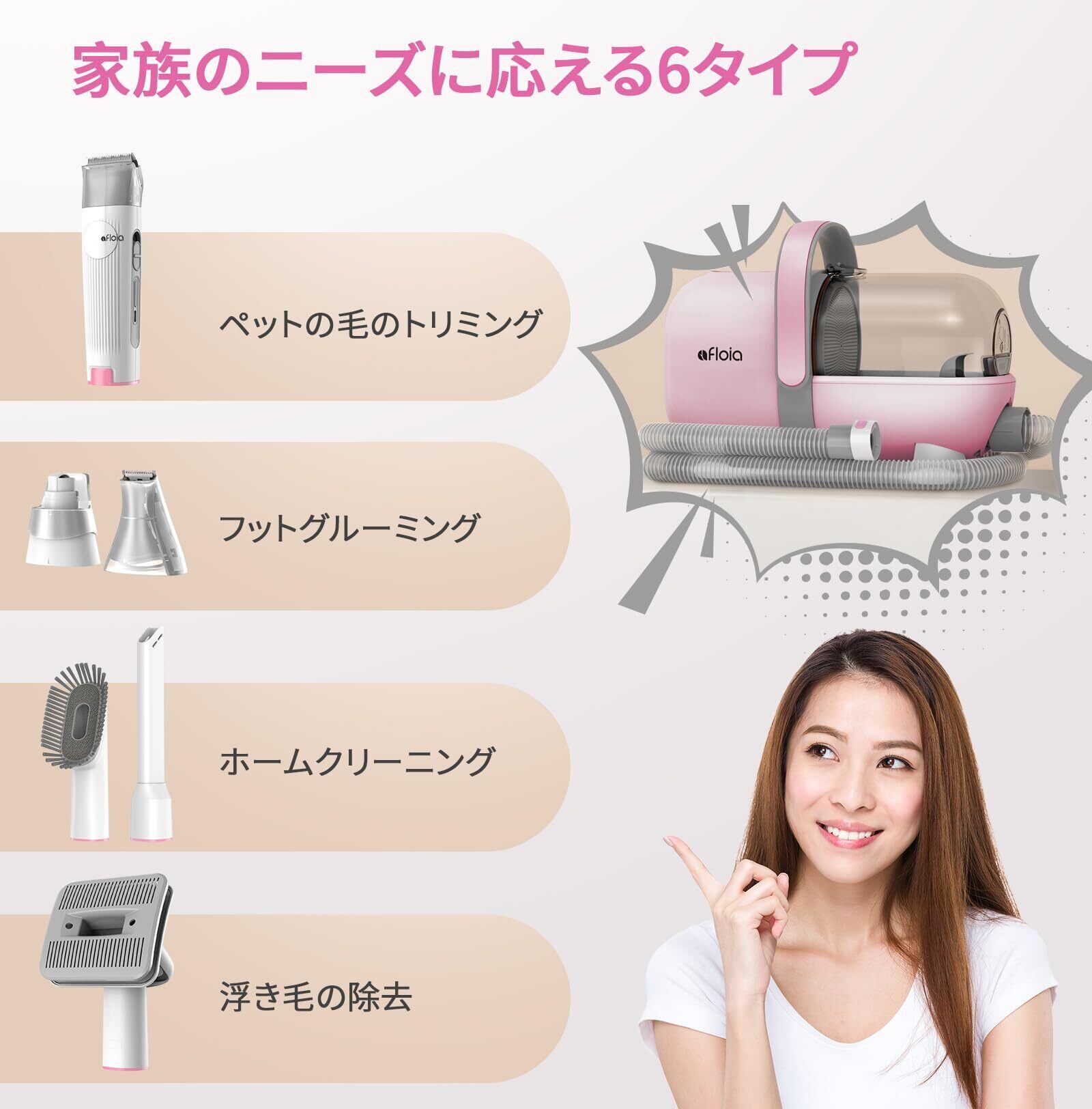 Afloia 6in1 犬 バリカン ペット用バリカンセット換毛期対策 犬 猫用トリミングキット 多機能ペットグルーミング掃除機 大容量 低騒音 3段階吸引力 ピンク