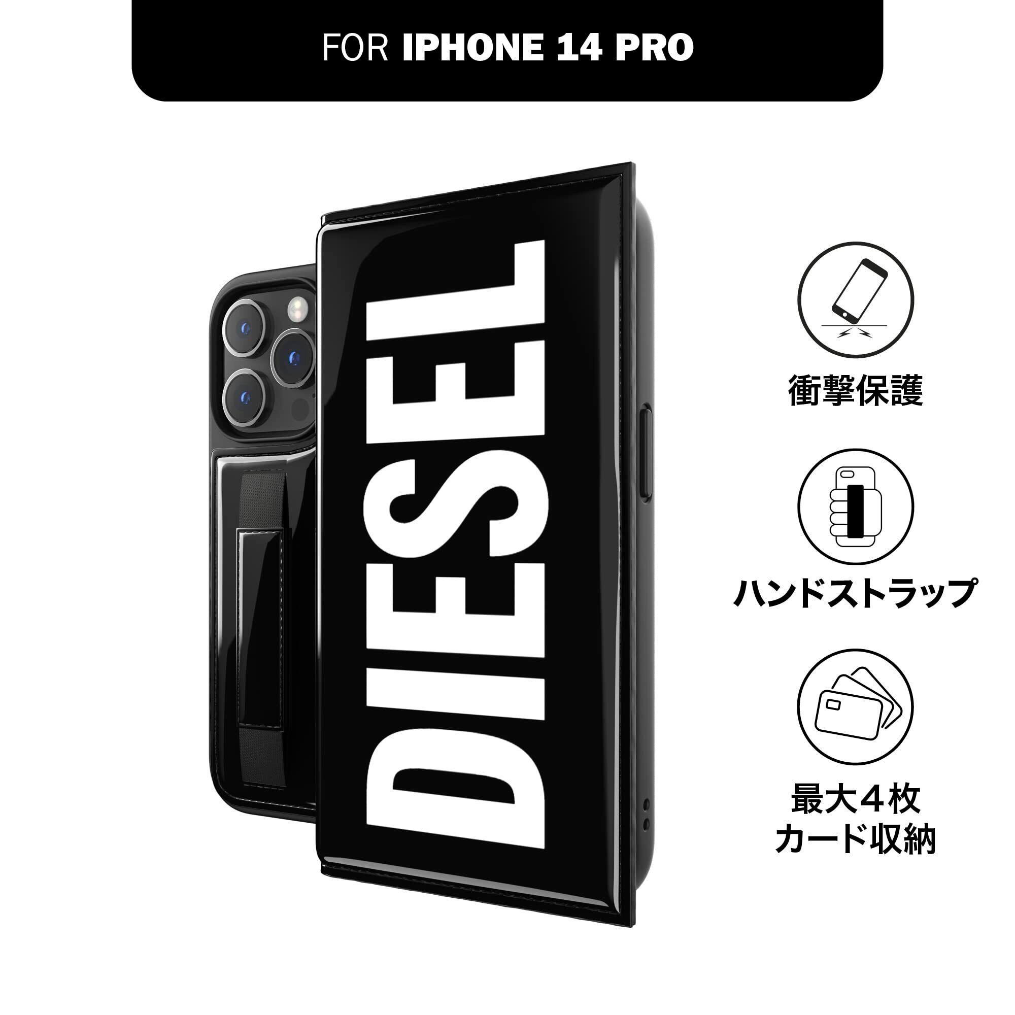 DIESEL iPhone14Proケース 手帳型 スマホケース カードケース 落下防止ベルト バンド付き FW22(ディーゼル ブランド ロゴ iPhone 14 Pro 手帳型ケース, ブラック) | lcsshop