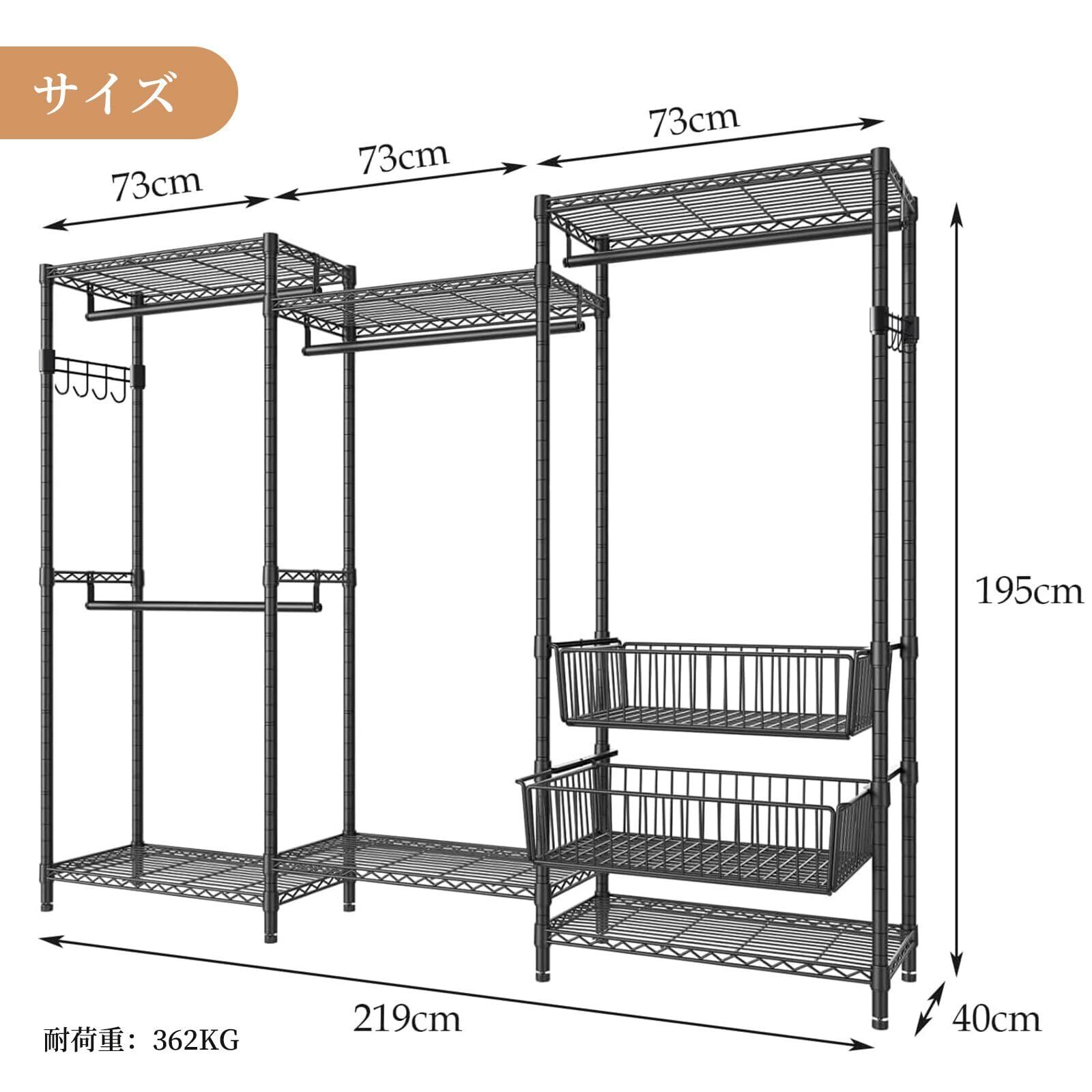 ハンガーラック 頑丈 ワードローブ 大容量 棚板高さ調節 洋服ラック 洋服掛け バスケット付き たっぷり収納 収納ラック 幅219x奥行40x高さ195cm