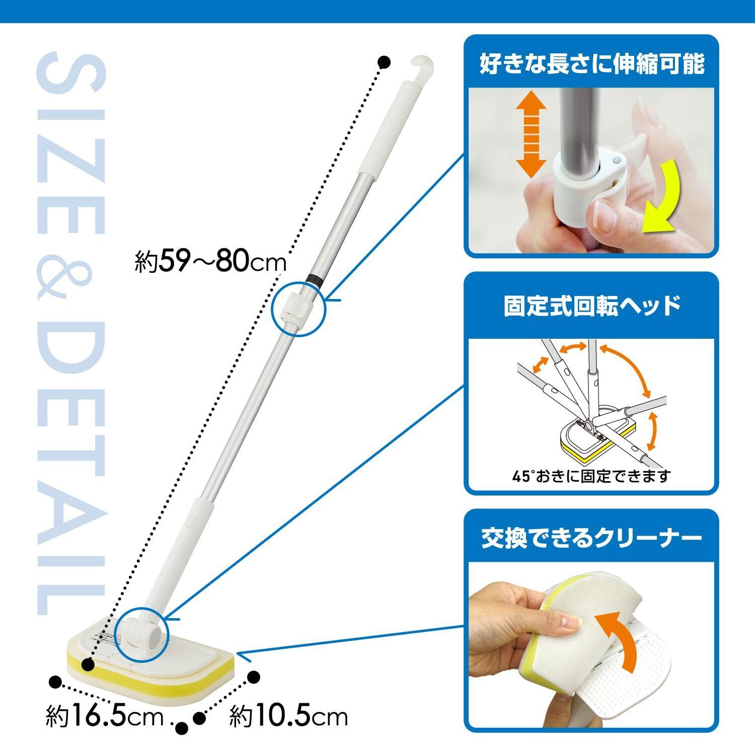 天井など高い所も、浴槽の底もラクに洗える「伸縮タイプ」で、持ち柄は最長約80cmまで伸ばせます。