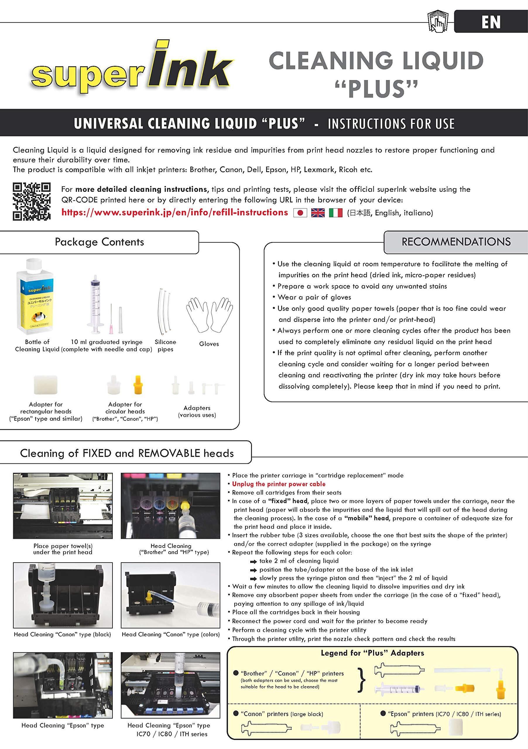 100ml クリーニング液 PLUS - superInk ユニバーサル 洗浄液 インクジェットプリントヘッド用(キヤノン エプソン ブラザー HP リコー)+ 手袋1組 + 10ml注入器 + ニードル + キャップ + シリコーン チューブ3本 + 7つのアダプタ