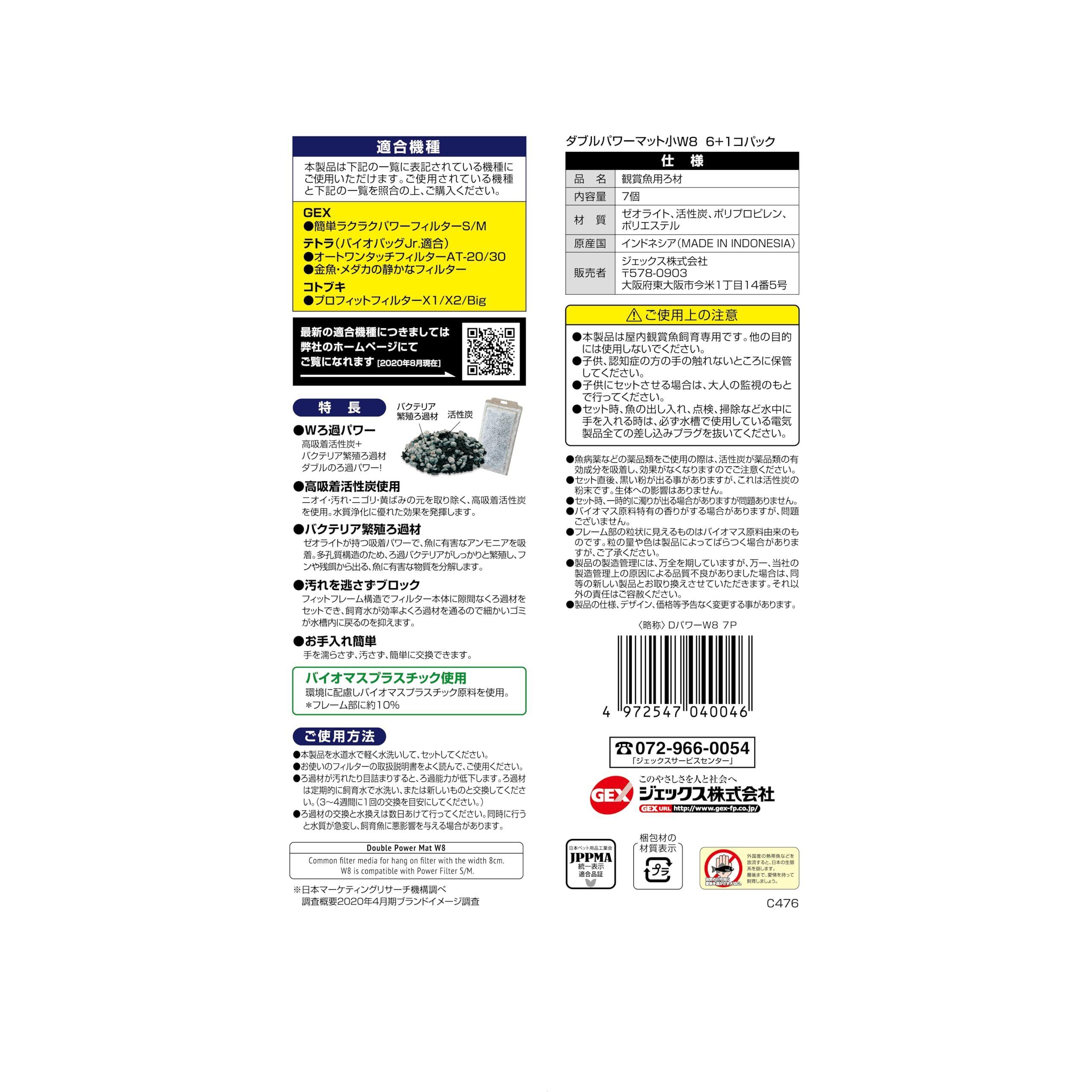 ジェックス GEX AQUA FILTER 外掛け共通 ダブルパワーマット 小 高吸着活性炭+バクテリア繁殖ろ過材 植物由来プラスチック使用 各社共通タイプW8 6+1コパック