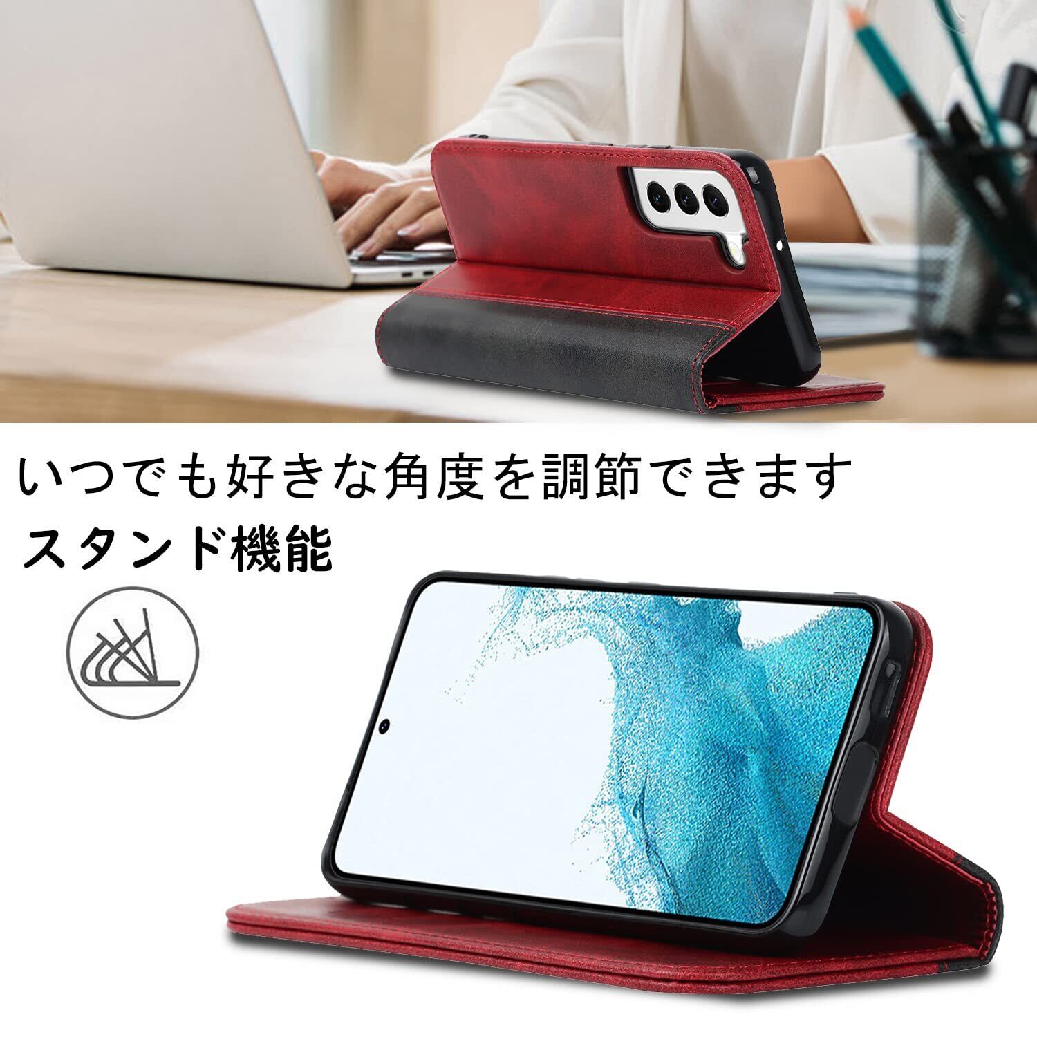 【収納機能】Galaxy S22 SCG13 SC-51Cケース内側には三つのカード入れとフリーポケットがつき、カード類や紙幣、名刺などが収納できます。カードスロットに2枚のカードを入れると、内蔵マグネットの機能を最大限に発揮し、カードが消磁されるのを防ぐことができます。横置きスタンド機能が付き、横向いて斜めに立てて、自由に角度を調整して、お好みの角度で動画鑑賞や読書などを楽しめます。長時間での新幹線、飛行機の中での暇つぶしに最適です。