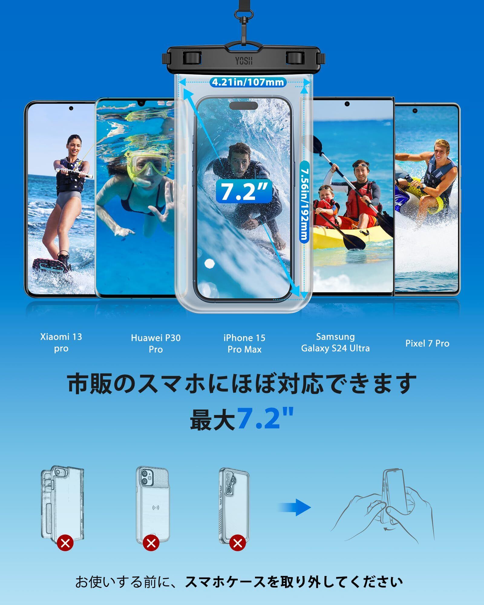 対応機種:YOSHスマホ防水ケースは、iPhone、AQUOS、ARROWS、Pixel、Xperia、Galaxyなど、スクリーンサイズ7インチ以下のスマホに対応しています。