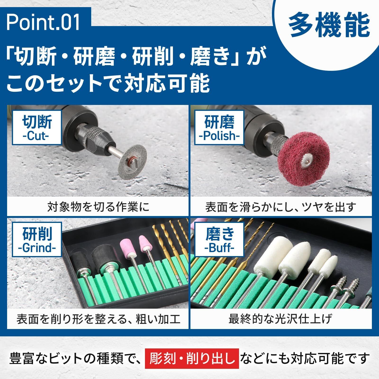 【切る・削る・磨くが全部できる!】このビットセットひとつで、切断・研磨・研削・バフが思いのまま。硬い素材も柔らかい素材も、思いどおりに加工できるからDIYの可能性が無限に広がります。ビットの種類は51種、内容量は驚きの303個!工作・ホビー・補修など、あらゆるシーンで活躍します。