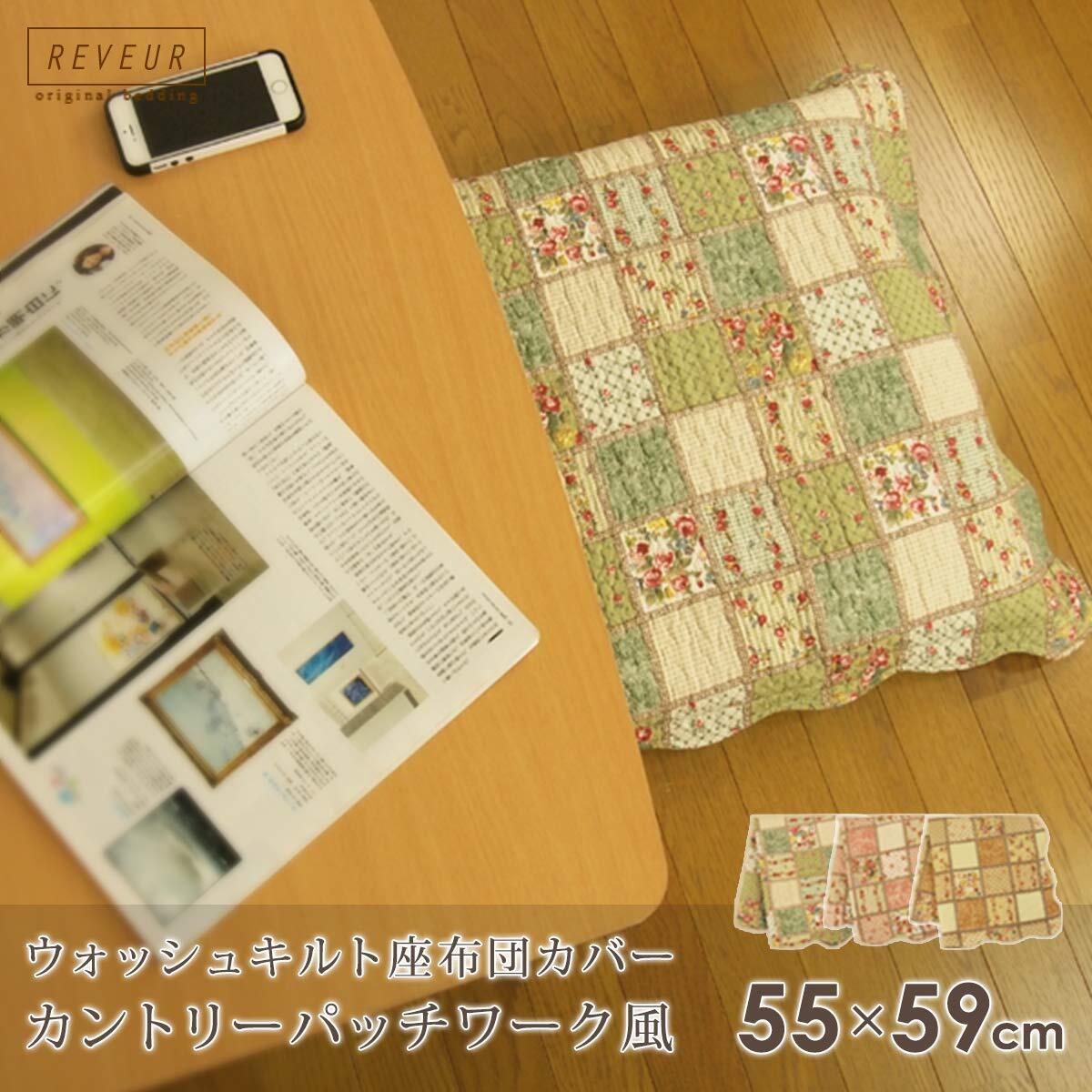 リヴェール 座布団カバー 5枚セット 55x59cm 銘仙版座布団用 綿100% ウォッシュキルト 水洗い キルティング パッチワーク調 1606- (グリーン)