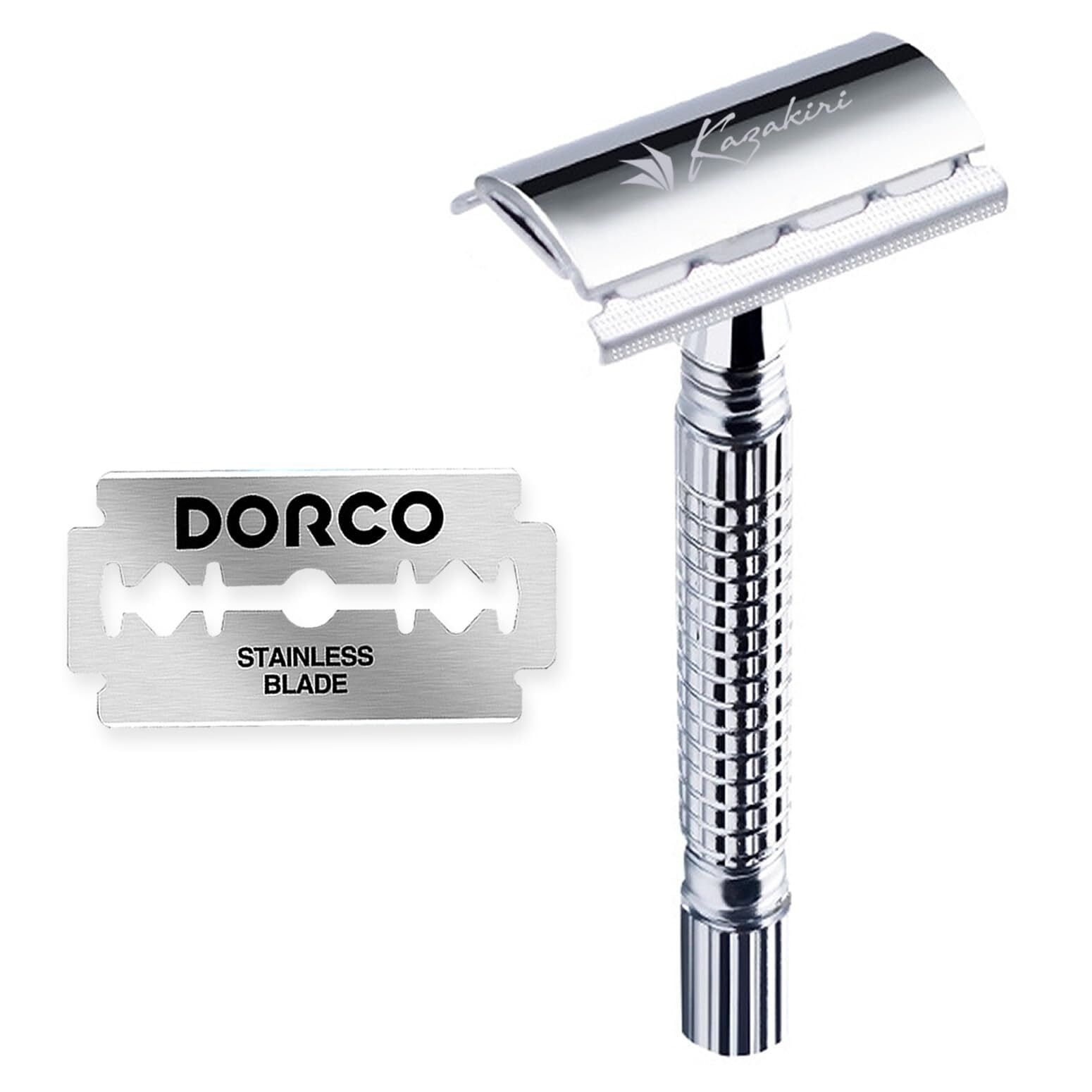 Kazakiri W 両刃カミソリ 剃刀 【感動深剃り】 髭剃り 顔剃り スネ毛剃り 替刃1枚付き メンズ 一枚刃 ダブルエッジ ホルダー 防水 シルバー カザキリ