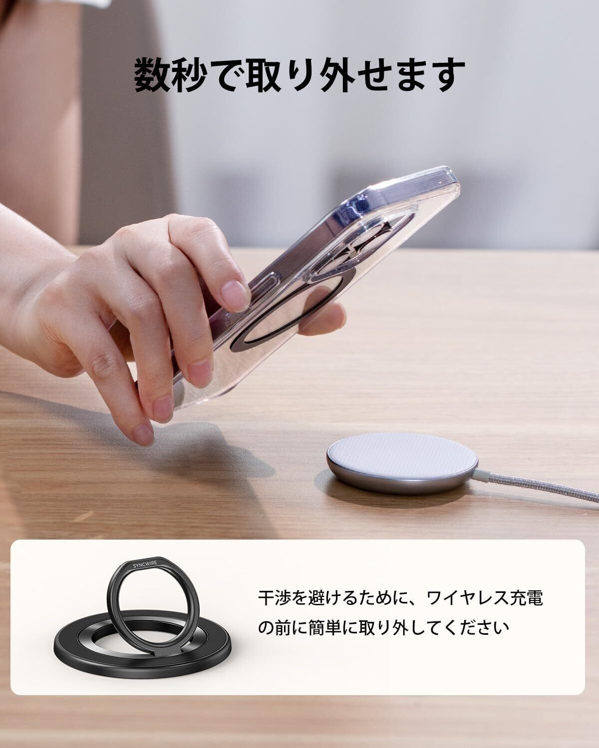 注意事項: 本製品はiPhone 16/15/14/13/12シリーズのMagSafe対応機種および保護ケースにご使用いただけます。 MagSafe に対応していないケースを使用している場合は、磁気を強化するために付属の金属リングを必ず取り付けてください。また、金属リングが電話ケースの内側ではなく外側に正しく取り付けられていることを確認してください。磁性体が正しく取り付けられていないと磁力が弱まり、落下する恐れがあります。