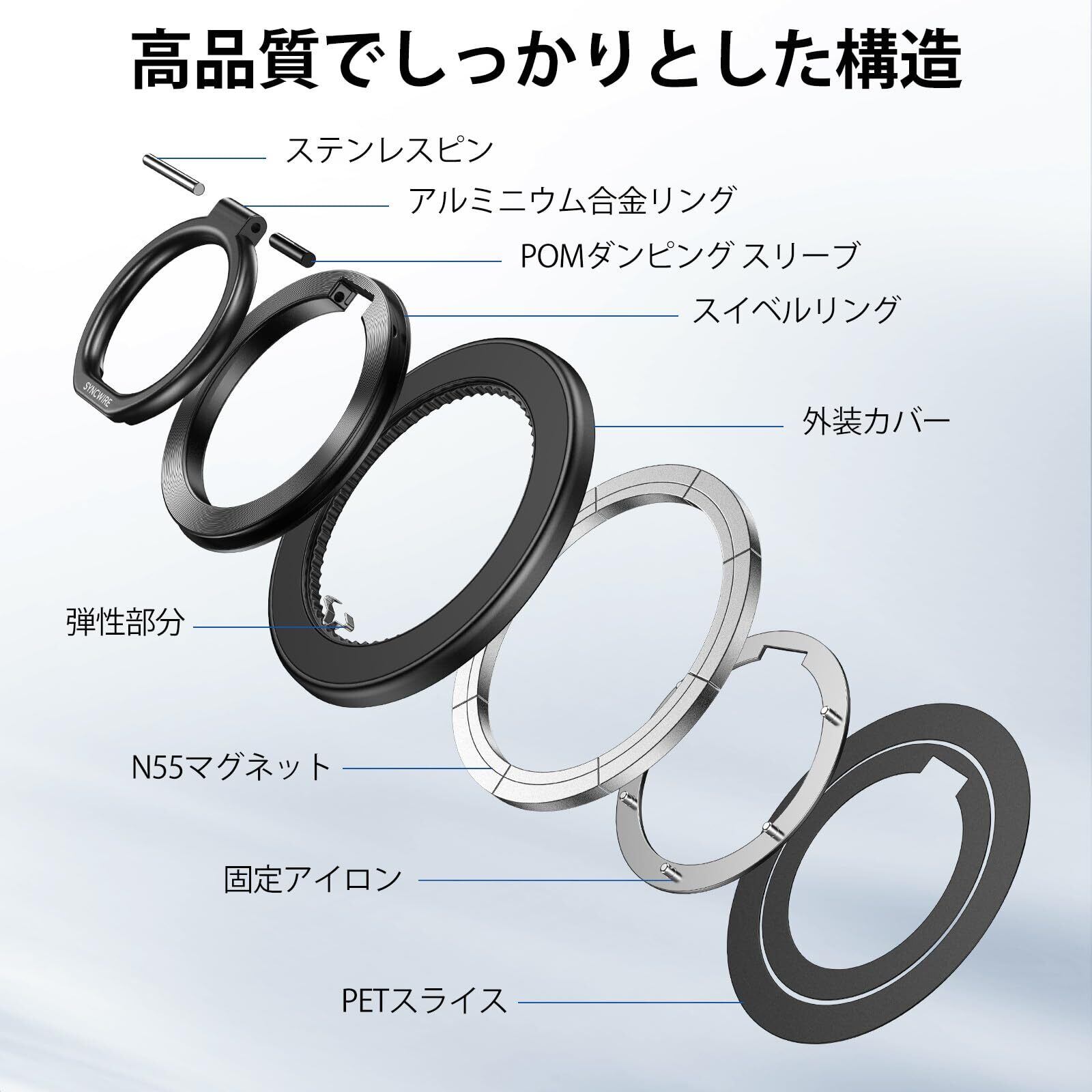 【360度回転】SYNCWIRE 両面マグネット MagSafe リング スマホリング 超强磁力 マグセーフ リング マグネット バンカーリング 超強力 薄型 角度調節可能 簡単着脱 iPhone 16 Pro Max 15 14 13 12 などに対応 アンドロイド 全機種対応 2枚メタルリング付