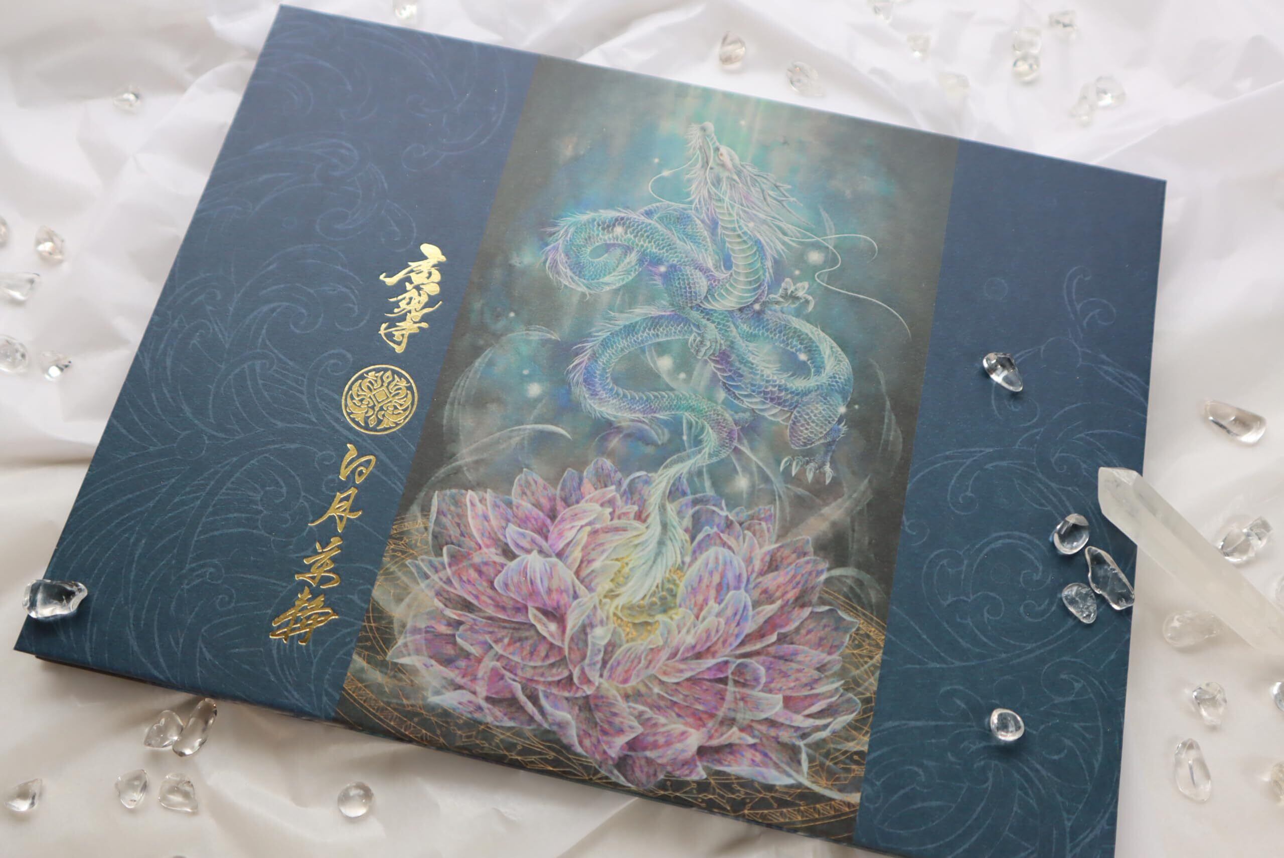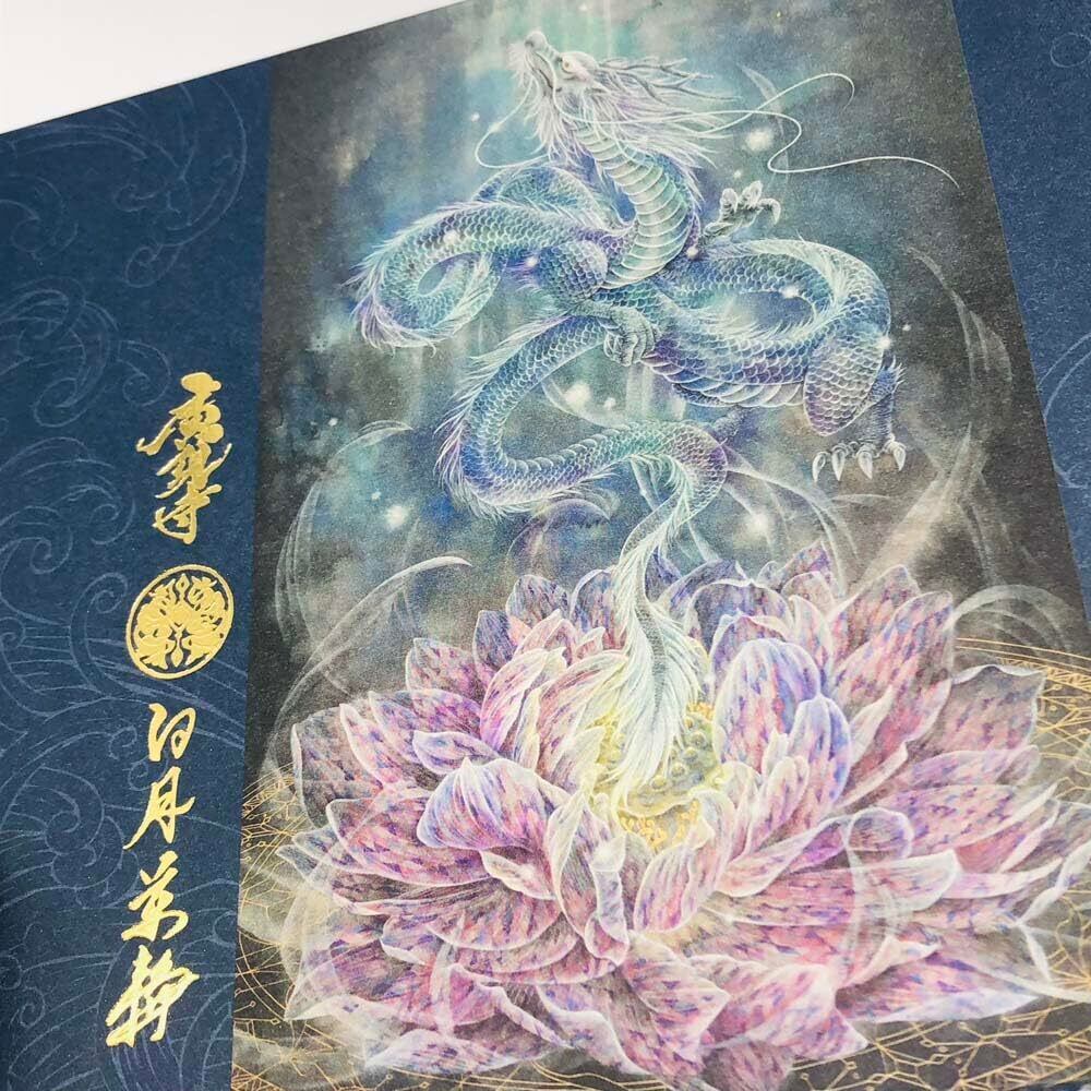 発売日 2024年6月1日(予定) 書き置き専用御朱印帳(ポケットタイプ)です。極楽浄土には、一人ひとりのための蓮花があるそうです。我々がこの世での命を終えると極楽浄土のその花が開き、またそこに生まれると言います。 そのイメージをもとに、今まさに蓮から生まれ出でんとする龍を描いた作品です。