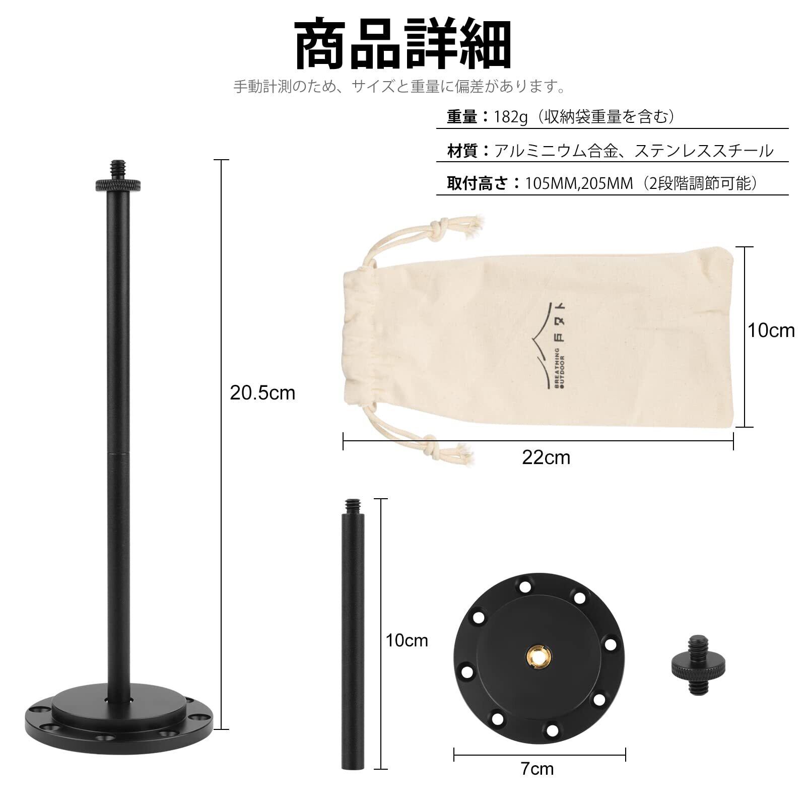 取り外し可能ランタンスタンド:商品サイズ:2本10cmポール、台座直径7cm、重さ:182g。スタンドは台座と2本のポールで構成され、ポールは1/4インチのねじインターフェースで接続し、高さは自主調節できます。 ポールとベースは他の製品と組み合わせることができます。