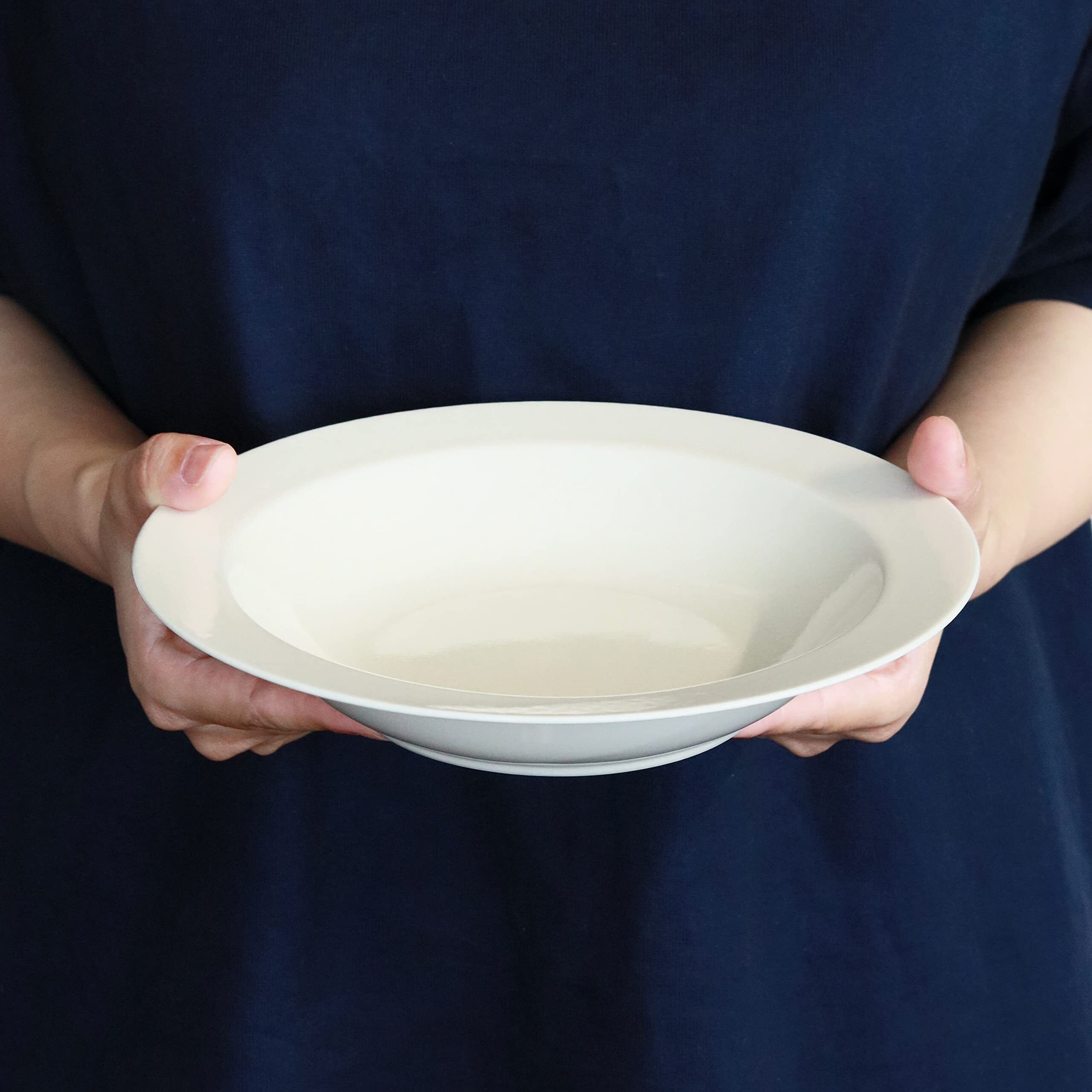 パスタやカレーはもちろん、深さがあるのでドレッシングをたっぷりかけたサラダや煮物など、汁気のあるお料理にもお使いいただけます。 様々なお料理と相性の良いお皿です。 リムがあるので配膳の際にも持ちやすく、お料理がこぼれにくいという実用性も兼ね備えています。