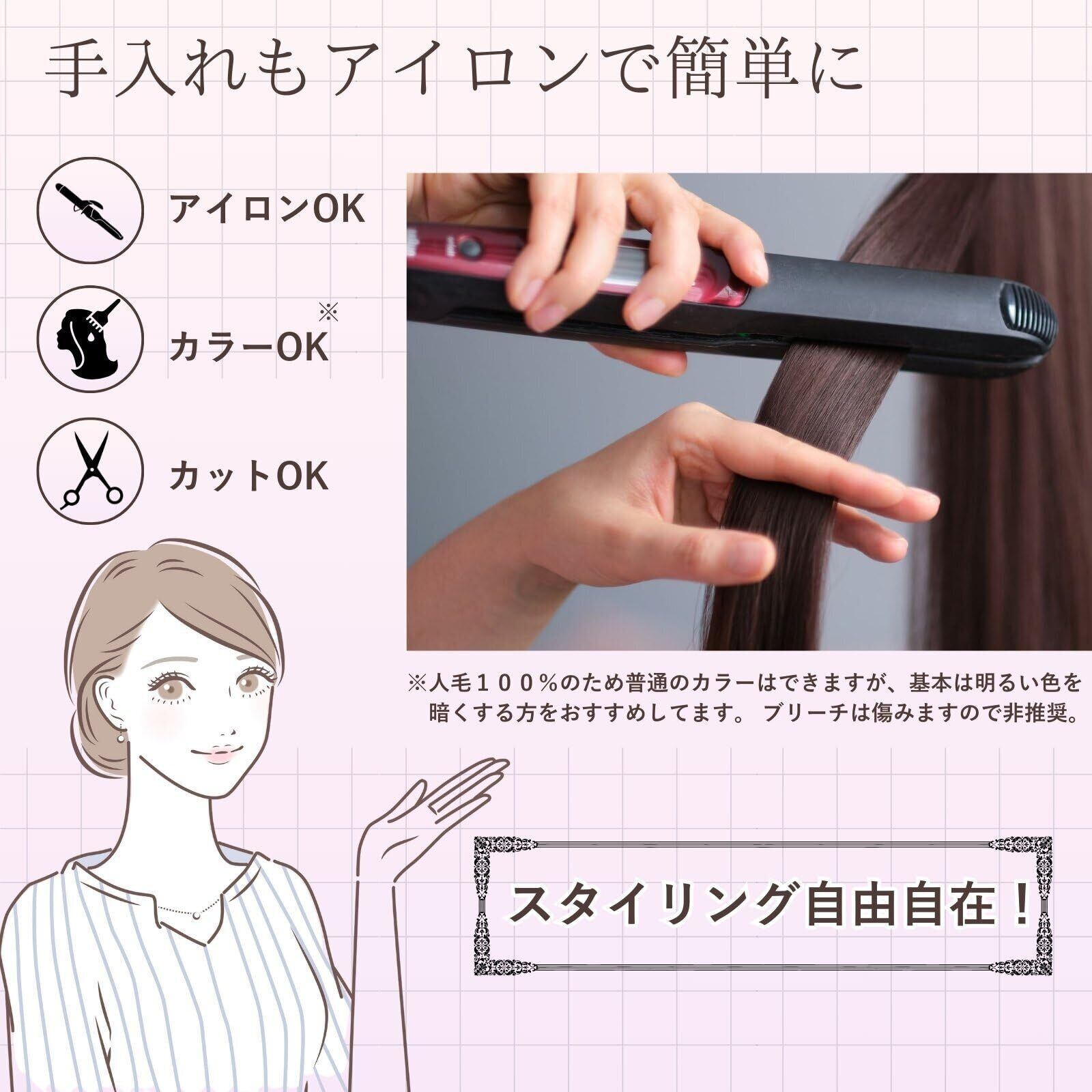 ドライヤー、コテをご使用できます(150度以下推奨) 人毛100%なのでスタイリング剤をつかいお好みのヘアスタイルがつくれます 洗髪はお手持ちのシャンプー(ノンシリコン以外)で手軽に洗えいつでも清潔に保てます