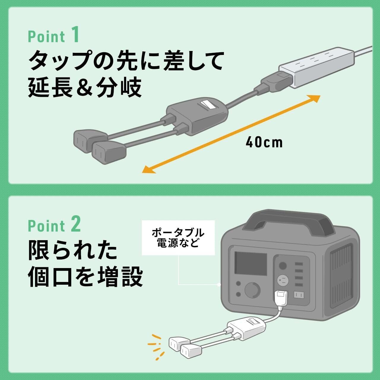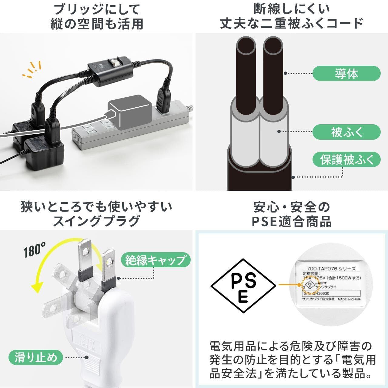 ACアダプタ の大きいプラグ使用時に他の差込口をふさがないため無駄なく設置できる、 分岐 タイプの 電源延長コード です。
