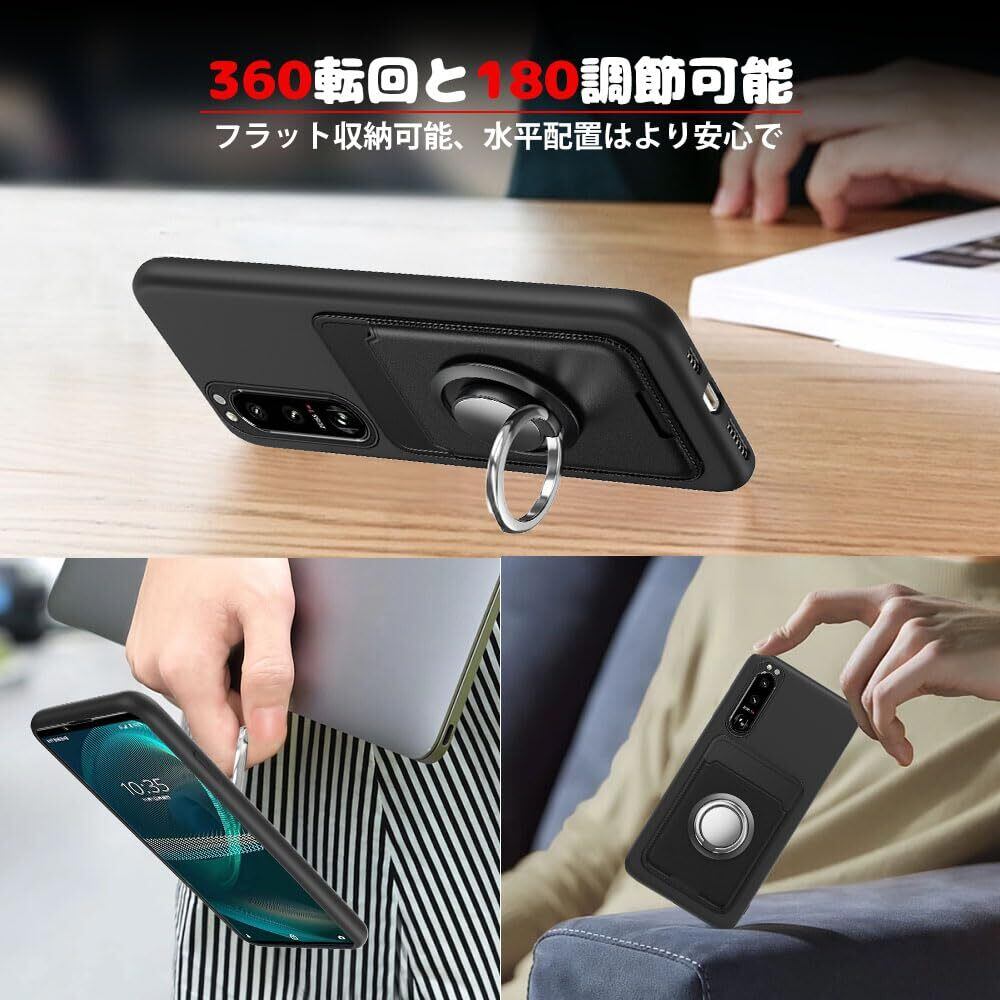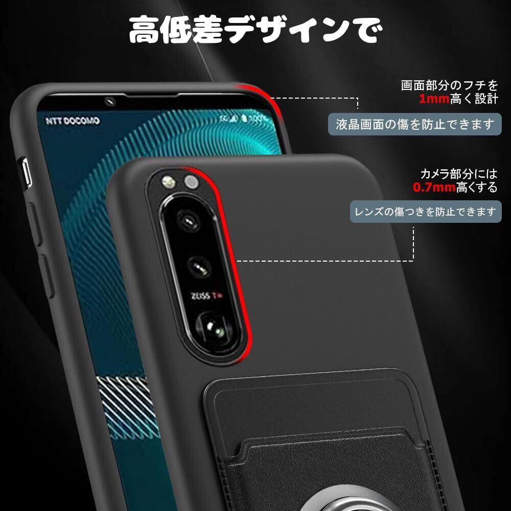 Xperia 5 III SO-53B ケース SOG05 | XQ-BQ42 カード収納 リング付き 保護カバー エスクペリア5iii スマホケース リング スタンド付き ストラップホール付き シリコン スタンド機能 マット質感 滑り止め 指紋防止 黑
