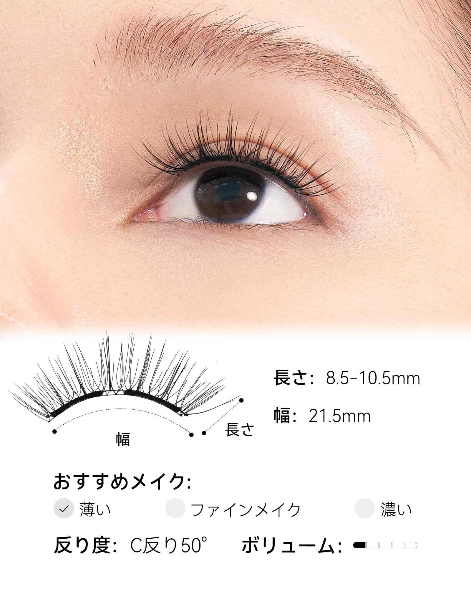 良質な動物実験フリー素材:動物実験フリー、清潔で、軽く、独特で快適。厳選した動物実験フリー素材による快適さ、柔らかい装着感を目に与えます。たっだ0.034gのつけまつげは、羽のようにふんわりで、目に呼吸感を与え、最高な快適さを手に入れます。(Tips:目はデリケートなので、つけまつげをつけたら、慣れるまで一定の時間が必要です)