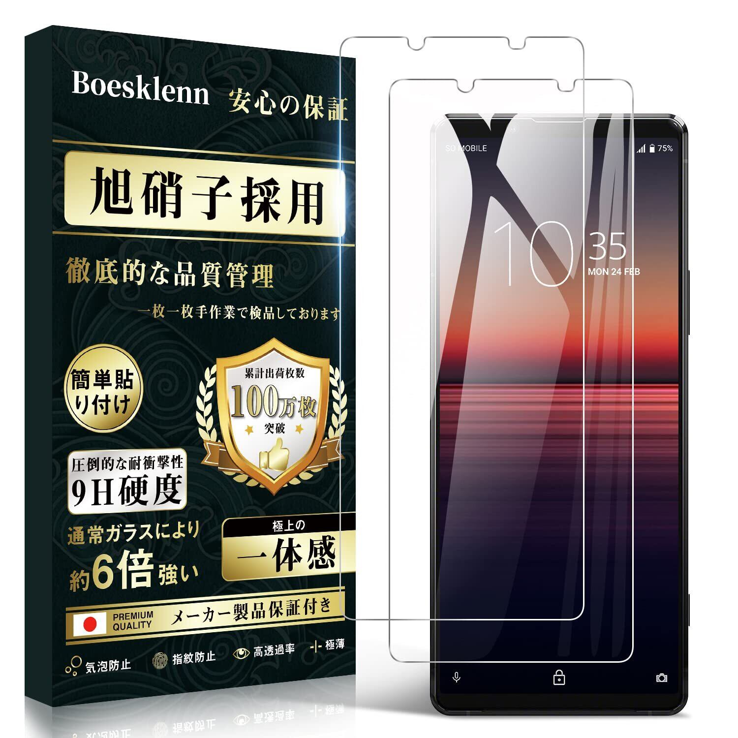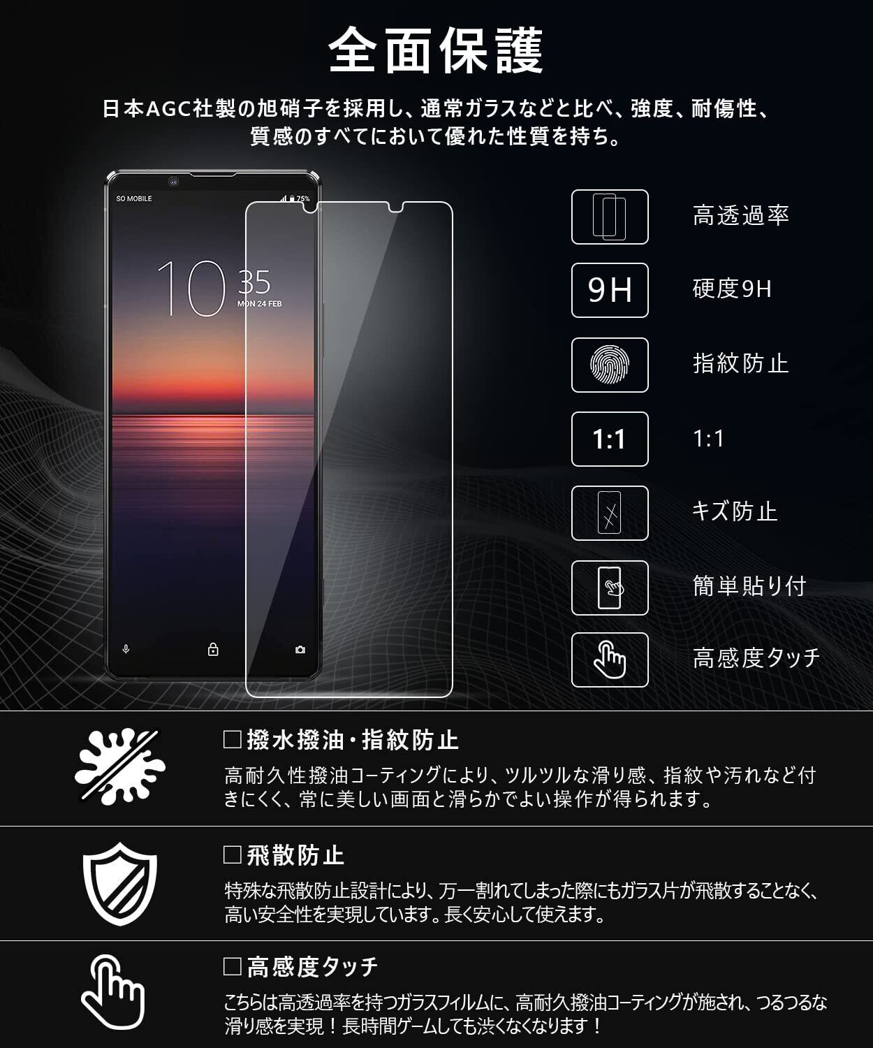 Xperia1II ガラスフィルム【2枚】 SOG01/SO-51A フィルム 日本AGC旭硝子製 0.26mm 9H硬度 自動吸着 気泡防止 高感度 飛散防止処理 エクスペリア 1ii ガラスフィルム