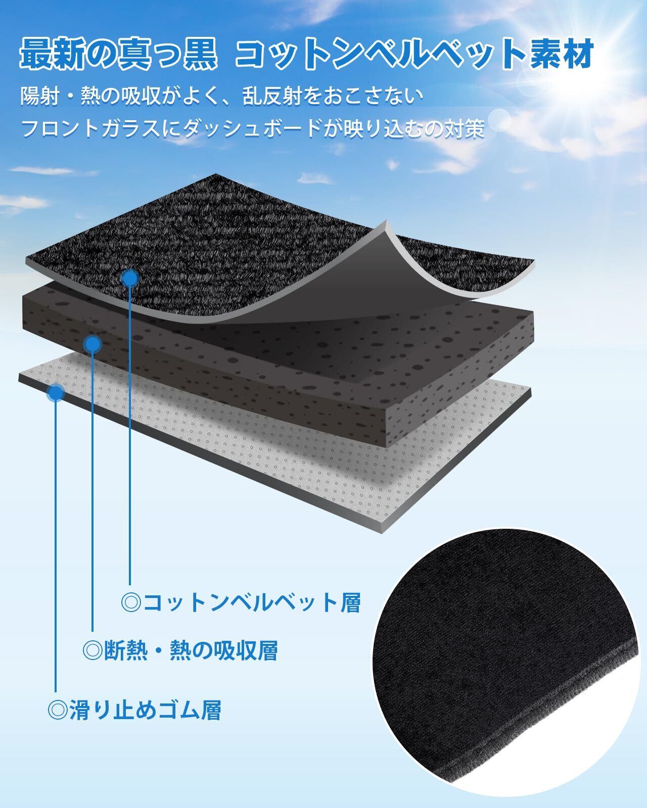 2.【高品質コットンベルベット素材】:素材は上質なコットンベルベット素材です、優れた耐熱性と耐久性をもっており、厳し環境の中でも安心して使用していただけます。環境に優しい材質を採用します。車種専用設計なので、違和感なくぴったりフィット、ダッシュボードカバーを装着することで紫外線からダッシュボードを守り、ホコリや汚れ、傷が付くことも防ぎます。