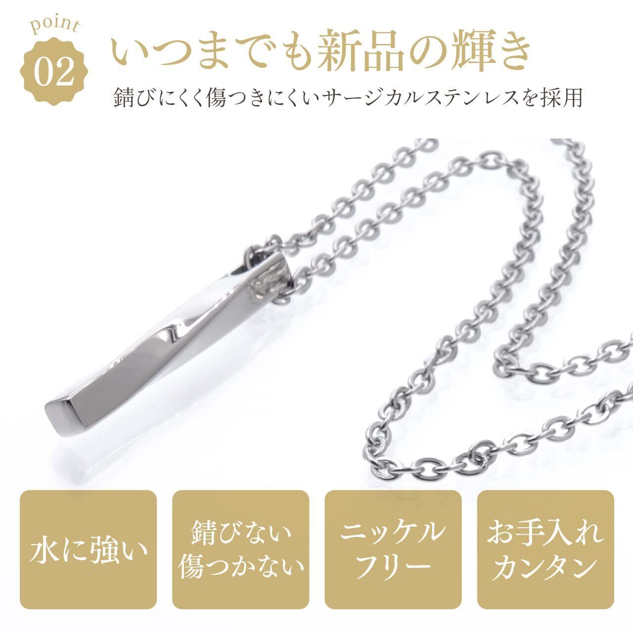 【アレルギーを起こしにくい材質】敏感肌の方にも優しいニッケルフリーを採用しています。ペンダントトップとチェーンはサージカルステンレスを使用し、耐久性と軽量さを両立しました。