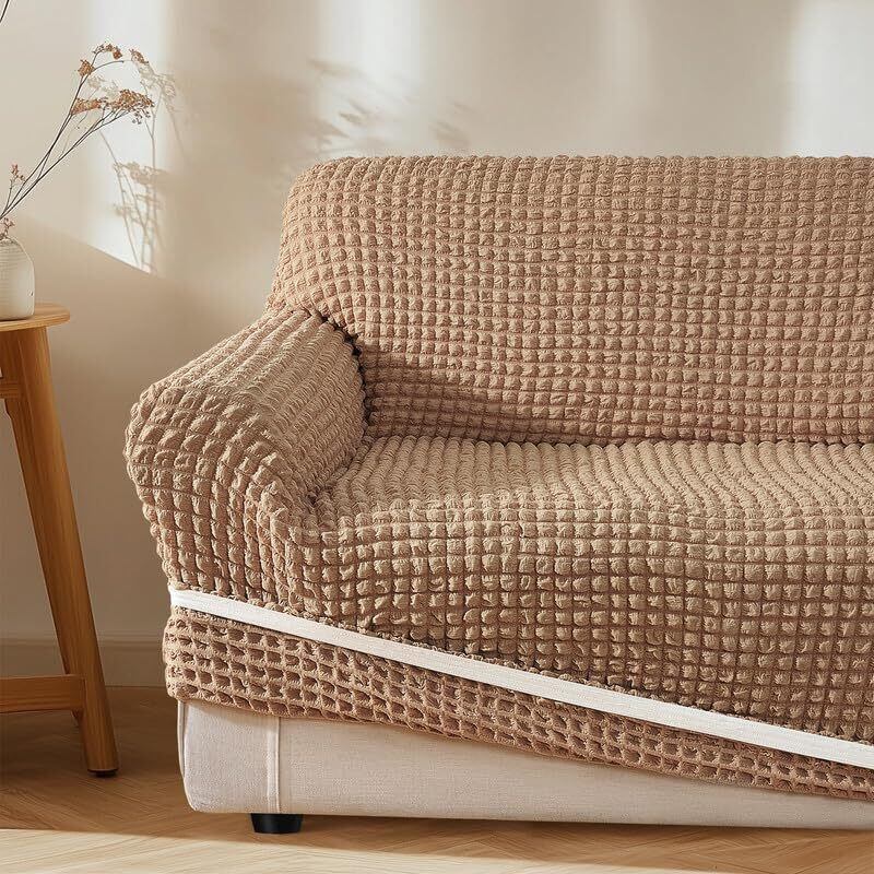 可愛くて高品質なポリエステル素材:ポコポコとした独特なテクスチャーが特徴で、丈夫でありながら柔らかく、肌触りも抜群です。キズや汚れを防ぎ、繰り返し洗っても縮まず、毛玉ができにくく、色あせも少なく、通気性にも優れています。弾力のある素材が様々な形やサイズのソファにしっかりフィットし、かけるだけソファカバー、ズレがない快適にお使いいただけます。長期間使用できる高品質な素材です。