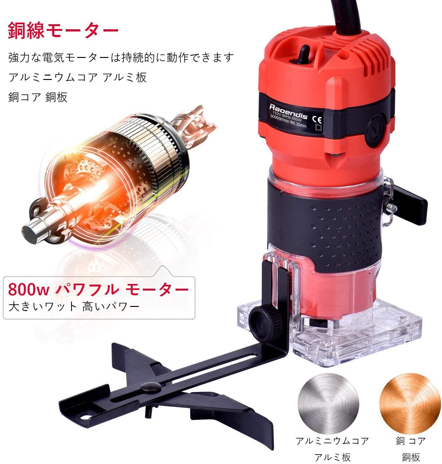 電動トリマー 木工用 透明ベーストリミング溝切り アルミシェル 木材の面取りや溝切り用 30000rpm高速回転 650-800W 日本取扱説明書 [赤い]