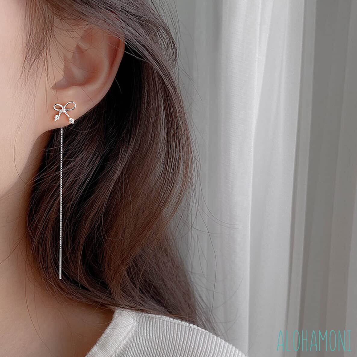 ALOHAMONI (アロハモニ) ロング タッセルピアス リボン ストーン デザイン スティック チェーン タッセル ゆらゆら 揺れる ロングピアス 両耳 2個セット 韓国 オルチャン | lcsshop