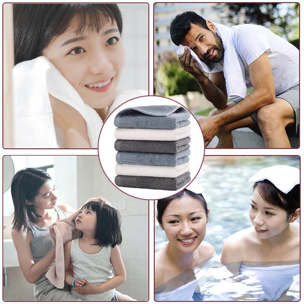 【フェイスタオル 6枚セット】素材:綿100%、サイズ:約35×70cm、重さ:約100g(1枚)、セット内容: ホワイト2枚 、ブルー2枚、グレー2枚。