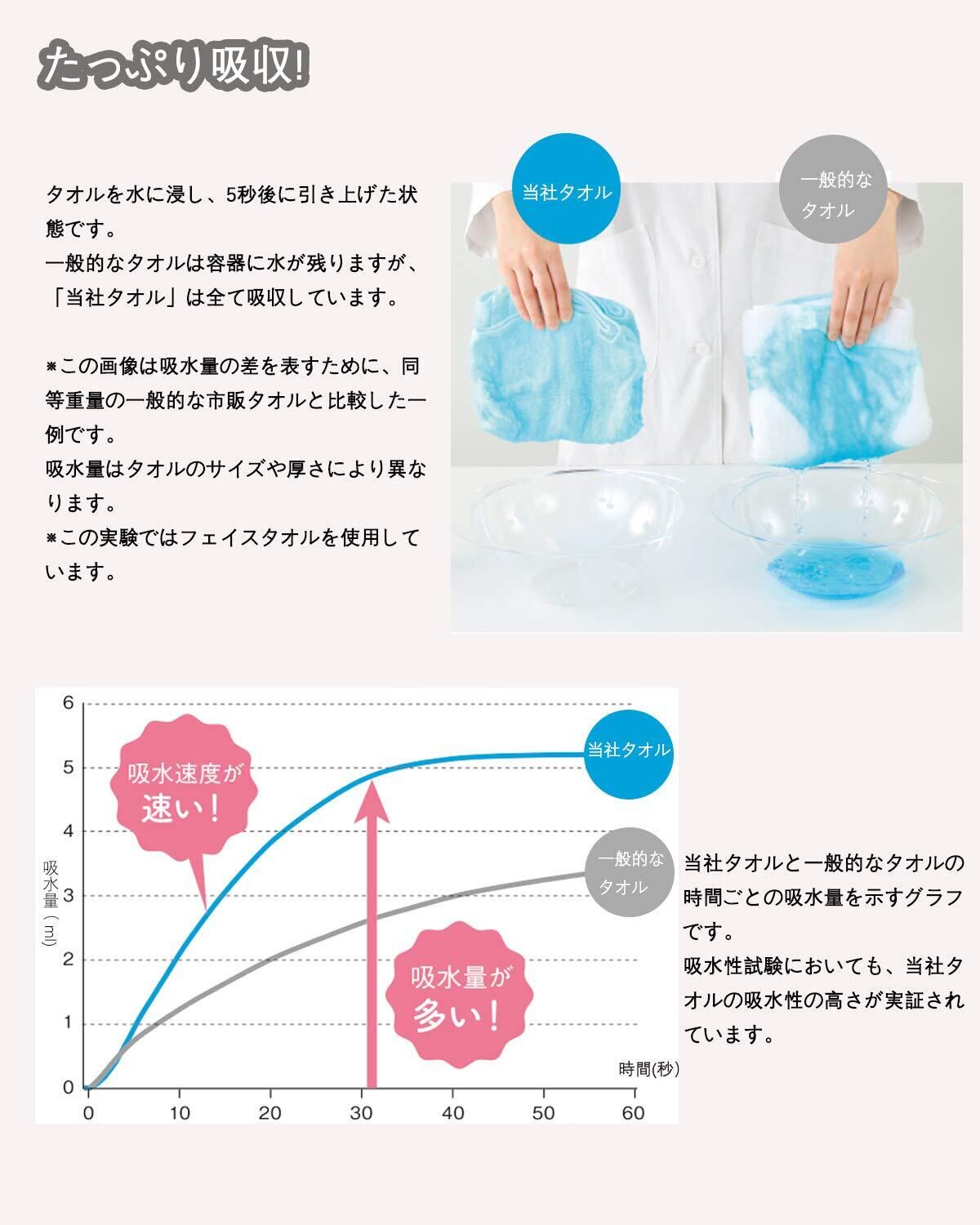 高い吸水性を誇るこのタオルは、素早く水分を吸収し、サッと水気を拭き取ります。また、乾燥も早いため、衛生面でも安心してご使用いただけます。毎日の入浴後やエステタオルとしても大活躍するアイテムです。